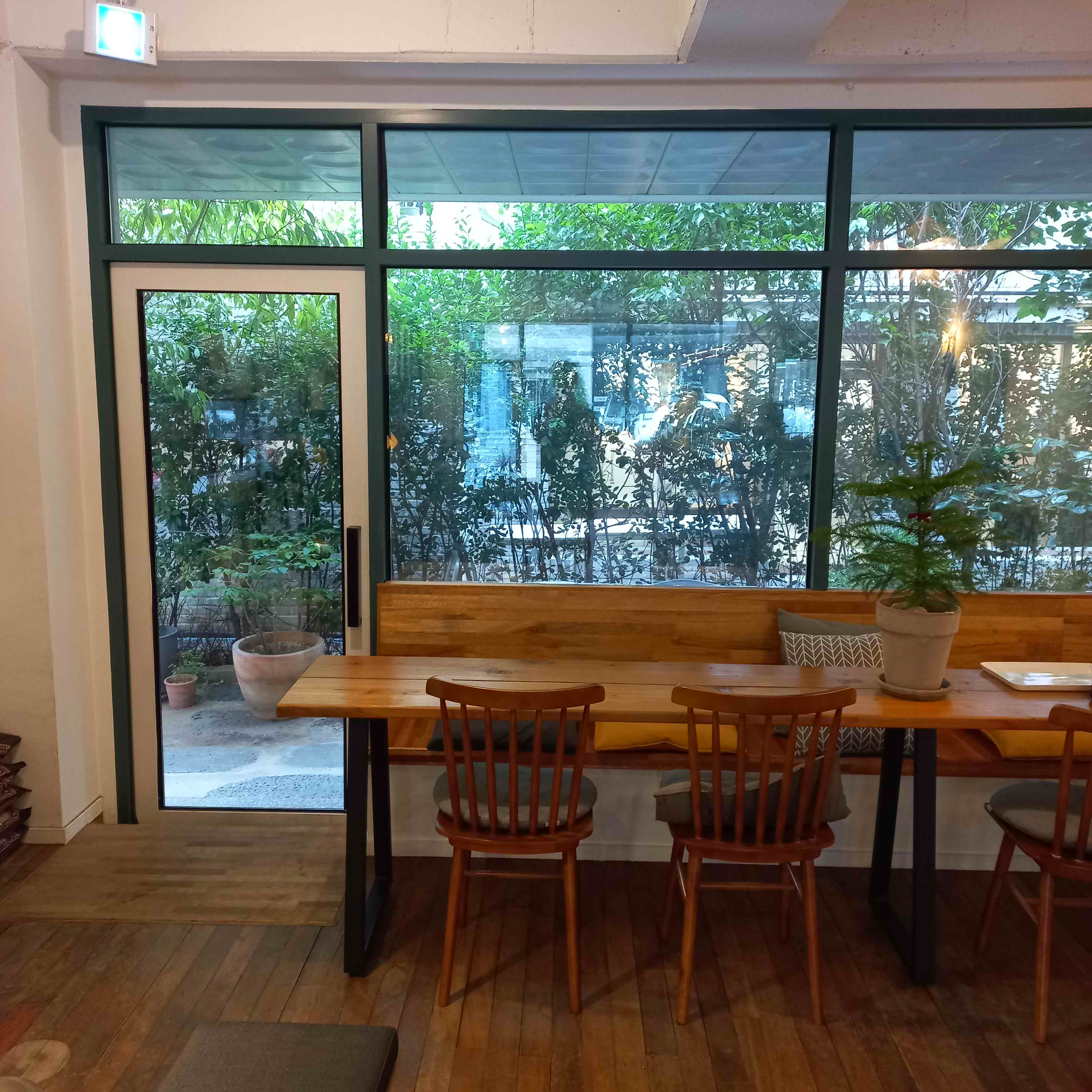카페 뒤편에는 나무들이 있어서 풀숲 안에 들어온 듯한 느낌도 듭니다 ㅎ 노란 조명과 나무 바닥 나무 테이블의 조합으로 따뜻한 느낌도 들고요.